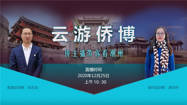 12月23至25日,中国华侨历史博物馆“云游侨博”网络直播活动第一次走出北京,开启侨乡直播之旅,首站来到著名侨乡,潮州。本次潮州直播分为两部分,一是围绕“亲情中华·战疫有侨”——海内外侨界凝心聚力抗击新冠肺炎疫情主题展潮州巡展,推出普通话、英文、广府话和潮州话直播讲解专场,由侨主播带观众在陈伟南文化馆室内“云逛展览”;一是循着习近平总书记在潮州考察时走过的路线,由中国华侨历史博物馆与潮州侨联主播联手,采用普通话和潮州话带领观众在室外“云逛侨乡”,领略了广济桥、广济楼、牌坊街的风采,共同感受潮州作为历史文化名城、著名侨乡的独特魅力,感受潮籍华侨浓厚的家国情怀。