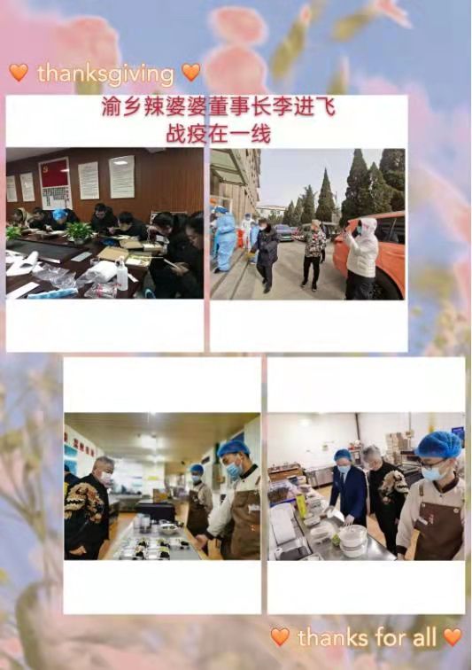 石家庄市侨联特聘委员、河北渝乡辣婆婆董事长李进飞带领团队自疫情防控工作开展以来,坚持每天为石家庄市第五医院医务人员等疫情防控工作人员派送三餐,全力支持疫情防控工作;在石家庄市政府开始筹建集中隔离点开始为集中隔离场所的建设者们送餐;同时李进飞董事长坚持每天通过媒体平台尽己所能帮助有困难的百姓解决生活所需,从米面粮油到药品、生活用品,努力做到事事有回应,件件有着落!