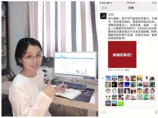 省侨联青年委员、石家庄市气象局环境气象中心技术人员王瑞洁,在得知单位二十余名职工为保证疫情期间气象信息的不间断发布,一直吃住在单位,通过发朋友圈通知单位同事到她在单位一墙之隔的闲置住房休息,为大家提供力所能及的帮助。