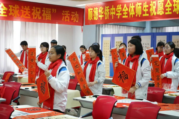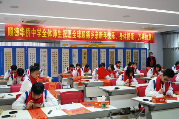 2021年1月20日,一场主题为“亲情中华,春联四海”的迎新年写春联全球送祝福活动在顺德华侨中学开展。世界顺德联谊总会携手顺德华侨中学用春联这一传统形式,向顺德海外乡亲致以春节的问候。