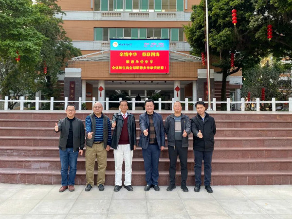 接着,在学校升旗广场,领导、书法家、老师、同学同台合照,大家手持刚刚创作完成的春联作品,齐声向海外顺德乡亲恭贺新春,祝福他们牛年吉祥,万事如意。