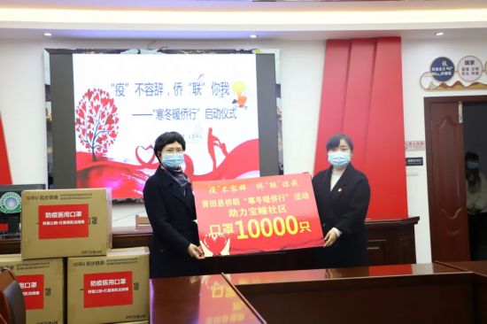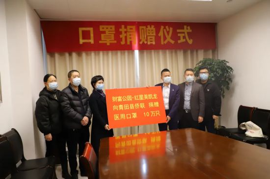 此次“疫”不容辞,侨“联”你我志愿者活动的口罩由财富公园·红星美凯龙公司捐赠。该公司共捐赠10万只口罩用于助力青田侨联“寒冬暖侨行”活动,帮助青田冬季“抗疫”,捐赠仪式于1月22日上午在县侨联会议室举行。