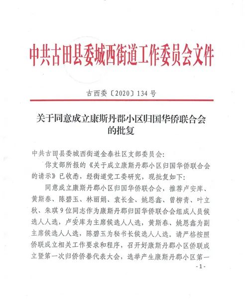 关于同意古田县康斯丹郡小区侨联成立的批复