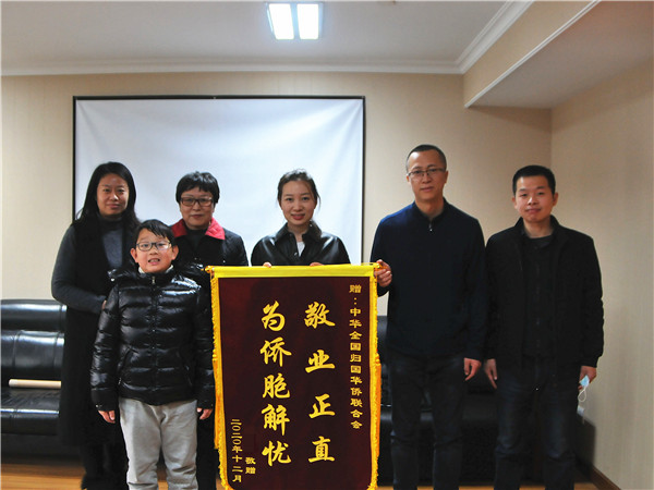 12月17日上午,在浙江投资经商的荷兰侨胞胡某的女儿胡女士带着孩子,专程从杭州赶到北京,将一面印有“敬业正直 为侨胞解忧”字样的锦旗送到中国侨联,以感谢权益保障部对胡某反映案件的关注和推动。胡女士表示,她代表父亲胡某及家人向权益保障部提供的及时、有效法律帮助表达最诚挚的谢意,侨联不愧是归侨侨眷和海外侨胞的“贴心人”和“娘家人”。