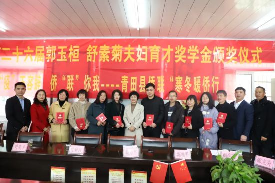 2月1日上午,第二十六届郭玉桓、舒素菊育才奖学金颁奖仪式在青田县三溪口学校顺利举行。丽水市侨联副主席、县侨联主席叶毅青,丽水市侨联副主席、三溪口侨联主席施海平,青田县侨联副主席叶先平,三溪口街道统战委员陈利平,三溪口学校校长赖宝宽等出席仪式。捐赠仪式由陈立夫主持。