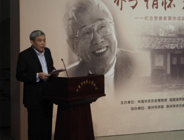 中国华侨历史博物馆馆长臧杰斌在开幕式上致辞。他说,黄仲咸先生以其艰辛的创业历程和无私的慈善实践展现了家国情怀、铸就了大爱人生,以一生的实践诠释了习近平总书记所说的“华侨一个最重要的特点就是爱国、爱乡、爱自己的家人”。侨博作为国家级爱国主义教育示范基地和全国文明单位,一直致力于宣传和展示华侨华人的奋斗历史和精神追求,我们要广泛宣传好、持久传承好像黄仲咸先生这样的侨界杰出先贤的感人事迹和崇高风范,让更多人了解和学习他们的事迹,受到教育和激励。