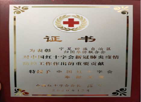 3月18日,宁夏回族自治区红十字会“为新冠肺炎疫情防控工作作出贡献突出捐赠人和志愿者代表颁奖仪式”在银川举行,这是中国红十字总会为弘扬伟大抗疫精神,凝聚更多人道力量为国奉献、为民造福开展的全国性表彰活动,宁夏侨联被授予“中国红十字奉献奖章”,全区共26个单位和个人获此殊荣。