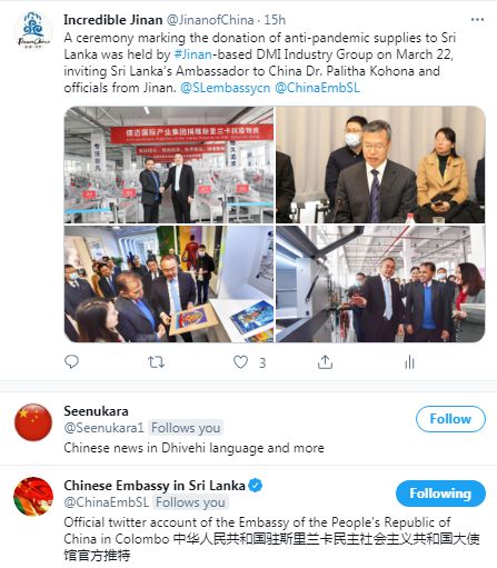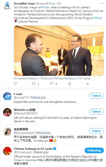 同时中国驻斯里兰卡大使馆官方推特关注济南市官方推特,并点赞“孙述涛会见斯里兰卡驻华大使科霍纳”、“济南爱心企业德迈集团向斯里兰卡捐赠抗疫物资”2篇推文。