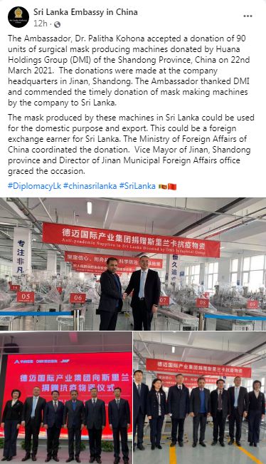 对此,斯里兰卡驻中国大使馆官方脸谱发布了“济南爱心企业德迈国际产业集团向斯里兰卡捐赠抗疫物资”相关贴文,表达对中国外交部、山东省政府、济南市政府、济南市外事办的感激之情。