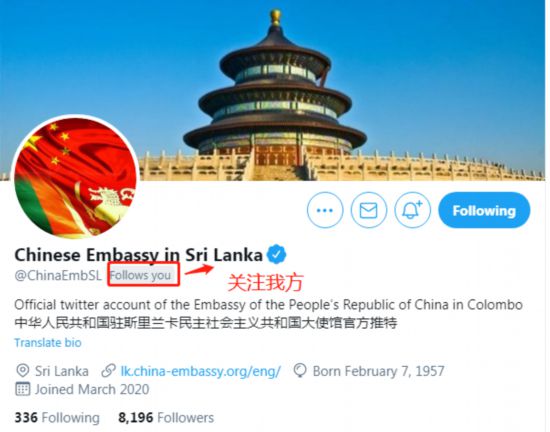 (中国驻斯里兰卡大使馆官方推特关注济南推特页面)