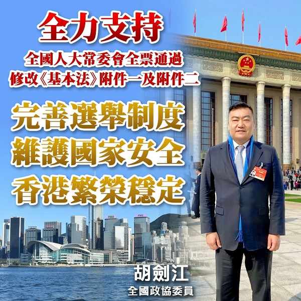 胡剑江表示,新修订的基本法附件获全票通过,充分获得人民的支持,修法过程规范有序,在尊重历史的基础上做出修改,内容非常具体可行。选委会在规模扩大、界别增加、分组优化、职能增加之后,覆盖面更广、代表性更强,社会各界参与度更加均衡,更能体现香港社会的整体利益。立法会席位分配方案更具广泛民意代表性,各个界别合理分配席位,充分巩固香港民主体制,也有助于强化特区政府依法施政的能力。可以确保中央精神和国家意志充分体现并最终得以通过实施,确保立法会真正担负起宪制责任,推动经济民生难题尽快解决。过往涉及香港政治改革、经济发展、民生改善的重要议案在立会屡屡碰壁的情况将有效避免,相信困扰港人多年的经济民生问题将加快妥善解决。