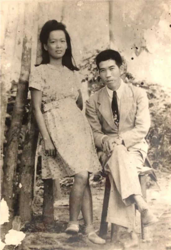 1945年8月与陈青山在琼纵根据地结婚,这是1948年11月部队打下定安县石壁墟后拍的第一张结婚照