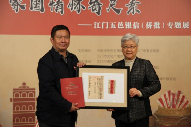 中国侨联顾问唐闻生为捐赠人罗达全先生的代表江门市博物馆馆长黄志强颁发捐赠证书。