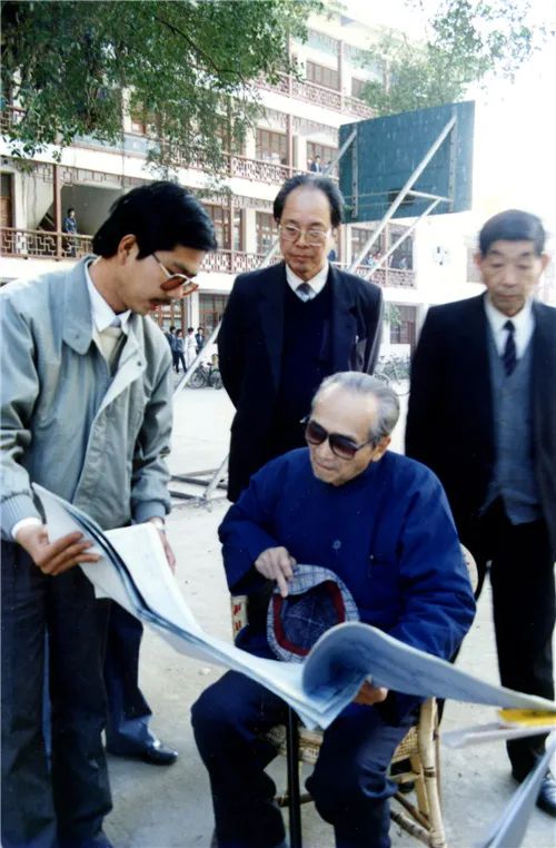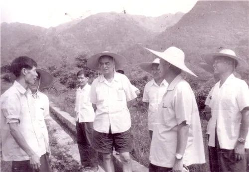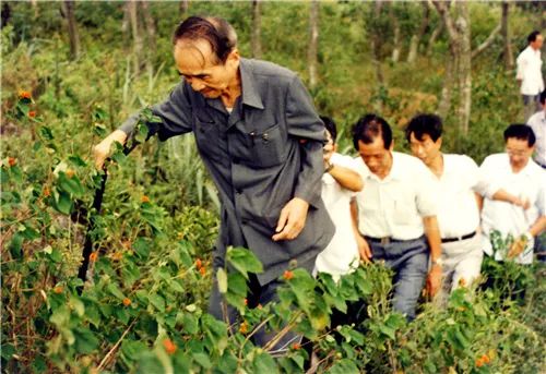梁披云(左一)拄着拐杖实地勘察黎明大学新校址