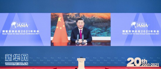 4月20日上午,博鳌亚洲论坛2021年年会开幕式在海南博鳌举行,国家主席习近平以视频方式发表题为《同舟共济克时艰,命运与共创未来》的主旨演讲。新华社记者 鞠鹏 摄