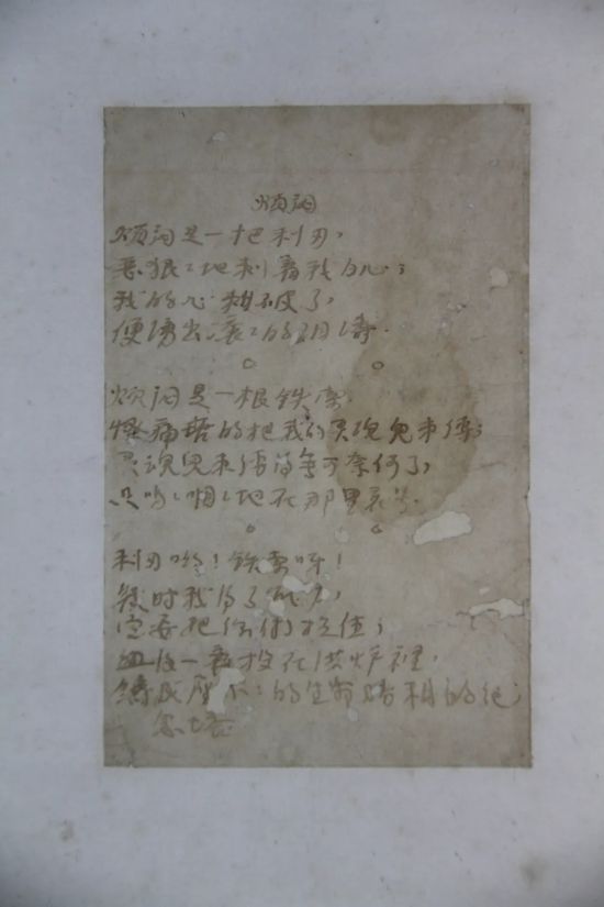 1935年8月,李得钊被判15年徒刑,转押至中央军人监狱。在这座被称作“天牢”的囚笼中,生活条件十分恶劣。监室人数众多,拥挤不堪,伙食是夹杂着沙子的霉米饭和烂菜汤,有时甚至连口水也喝不上。李得钊的身体不断恶化,瘦骨嶙峋的他健康每况愈下。面对幽暗无边的牢狱生活,李得钊也有过彷徨与低潮。他曾写下一首诗《烦闷》,用“利刃”“铁索”等意象作比喻,生动地描述了其当时内心的苦痛:“烦闷是一把利刃,恶狠狠地刺着我的心”,“烦闷是一根铁索,怪痛苦的把我的灵魂儿束缚”;然而,革命者顽强的意志并未因一时受挫而有所动摇,清醒的理智促使他不在忧郁中继续沉沦,信念的力量又使他心中重新燃起抗争的火焰。他在诗中最后一段写道:“利刃哟!铁索呀!几时我有了能力,定要把你们捉住。然后一起投在烘炉里,铸成座小小的生命胜利的纪念塔。”彰显出一位革命者坚强非凡的自制力和誓同敌人斗争到底的决心。