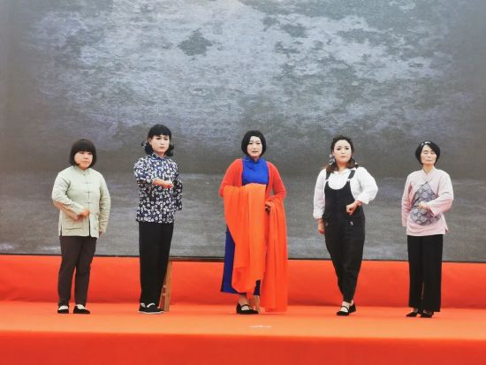 马鞍山市湖阳农民京剧艺术团孙珊珊(中)表演京剧《江姐》绣红旗