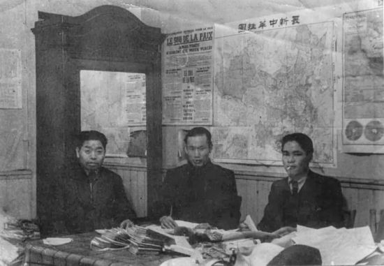 1936年到1938年间,林德光(右)、金直夫(中)、黄里(左)在巴黎《救国时报》社合影