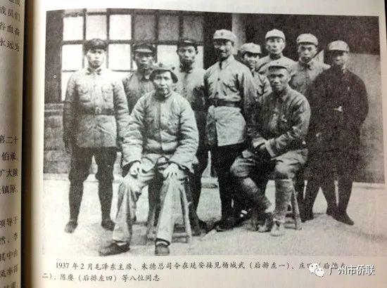 1937年,毛泽东主席、朱德总司令在延安接见杨成武(后排左一)、庄田(后排左二)、陈赓(后排左四)等。