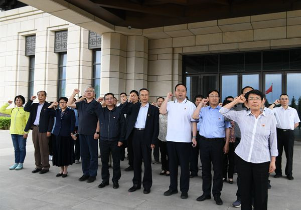 参观前,在香山革命纪念馆二层东侧,隋军领誓,万立骏和中心组(扩大)成员面对党旗庄严举起右手,共同重温入党誓词,重温入党初心,再受深刻洗礼。