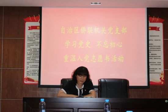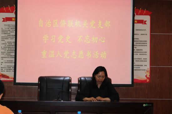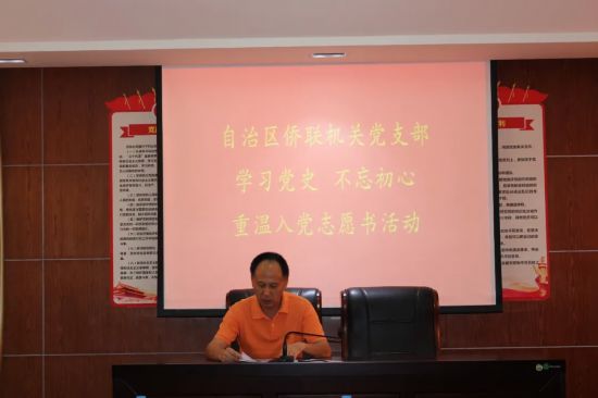 为推动党史学习教育走深走实,践行党员初心使命,根据广西侨联党史学习教育计划安排,5月26日下午,自治区侨联党支部召开一次特殊的党小组会议,组织全体在职党员,开展一次触动灵魂的“重温入党志愿书”活动,会议由党小组组长蒋政科主持,自治区党委党史学习教育办第三巡回指导组朱华,组员张洪、邓承志,在职党小组党员,以及机关部分非党员干部职工列席会议。