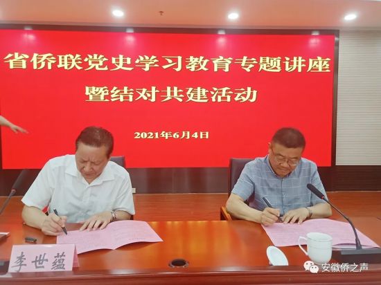 会上,李世蕴与陈卫东签订了《安徽省归国华侨联合会与安徽省新四军历史研究会结对共建协议书》。