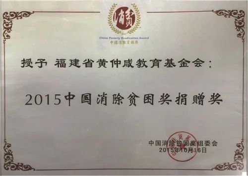 2015年10月,黄仲咸教育基金会荣获“2015中国消除贫困奖捐赠奖”,国家主席习近平在北京人民大会堂亲切接见了基金会理事长黄涤岩,以表彰基金会在精准扶贫方面做出的特殊贡献。
