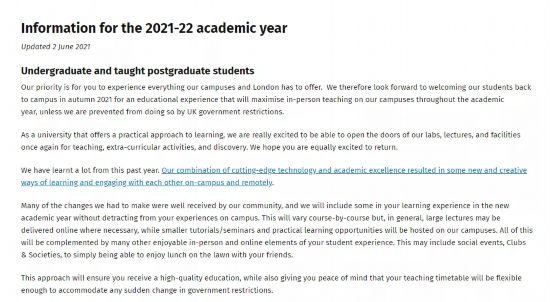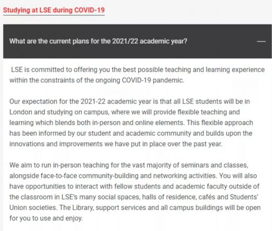 伦敦政治经济学院表示,学校希望在2021-2022学年, 所有学生都能在伦敦的校园内学习,并将提供融合线下和线上的灵活教学模式。