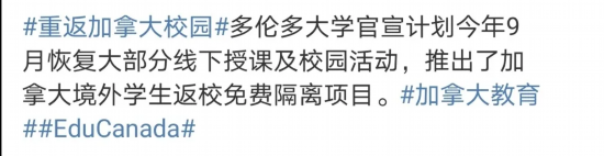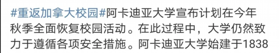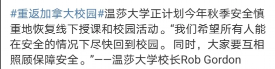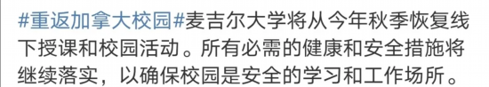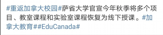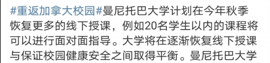 根据加拿大大使馆微博发布的消息,目前已有多所加拿大高校宣布了秋季学期计划,包括渥太华大学、多伦多大学、阿卡迪亚大学、曼尼托巴大学、温莎大学、麦吉尔大学、蒙特利尔大学、阿尔伯塔大学、萨省大学。大部分学校都计划在确保安全的情况下,于秋季学期增加更多的线下授课课程和校园内活动,为学生提供全面丰富的校园体验。(戴晨)