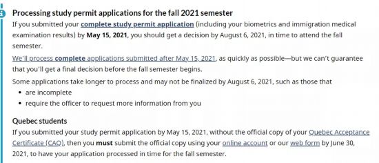 对于计划在2021年秋季入学的留学生们,加拿大移民局也给出了具体的时间安排,如果学生在5月15日前完成了学习许可申请,那么就将在8月6日前收到结果,以便能按时开始秋季学期的学习,对于5月15日之后的申请,移民局将尽快处理,但不能保证在秋季学期开始前提供申请结果。