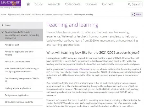 曼彻斯特大学表示,为最大程度地灵活应对英国政府针对新冠肺炎疫情可能采取的措施,校方期待新学年所有学生能够在校园内上课,并采取线上线下相结合的授课方式。在家上网课的形式不是统一默认的授课模式,为此不同院系会向各自学生书面确认具体授课方式,对确有困难不能来校上课的学生,也会通过线上课程确保学生的学习体验。、