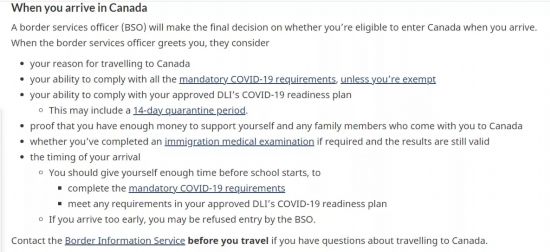 根据加拿大移民局发布的消息,留学生入境加拿大时,边境服务官员将会考虑的问题包括:入境加拿大的原因;遵守所有新冠防疫政策的能力除非得到豁免;遵守DLi中新冠相关政策的能力(可能包括14天的隔离期);有足够的钱以支撑自己及家人在加拿大的生活;已完成规定的体检,并且到达时体检结果仍在有效期内;开学前有足够的时间(如果过早入境,可能会被拒绝进入);完成强制性的新冠相关要求;满足DLi中新冠相关要求。