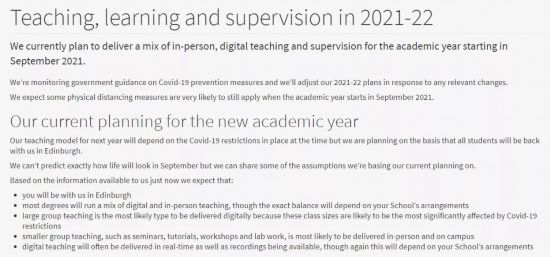 爱丁堡大学宣布,2021年秋季学期将于9月20日开始, 对人数较多的课程,大概率将采用线上教学的模式,而人数较少的课程,比如seminars, tutorials, workshops, lab work等将可能在学校线下开展。最终计划会根据疫情变化情况和国家政策进行适当的调整。