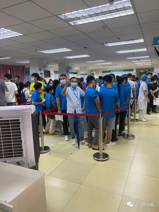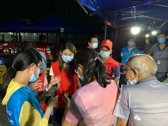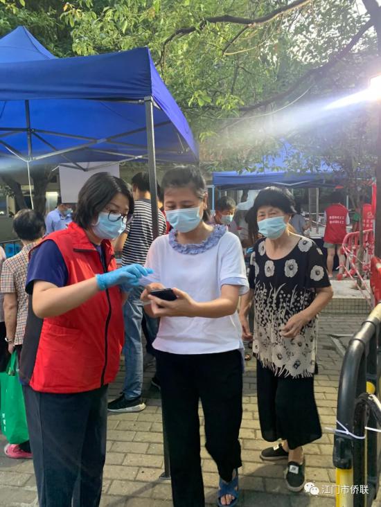 这三天江门持续高温,市侨联志愿者们穿着义工服,工作半小时都已汗流浃背,人流量又多,几个小时都顾不上喝一口水。现场中,他们有条不紊地指引群众扫码录入信息,疏导群众有序排队、保持安全距离、安抚群众情绪,一刻也没有懈怠,坚持做好支援工作的每一个细节。特别针对老年人、残障人士等不擅长使用智能手机人群,市侨联志愿者们采取“一对一、一对多”模式指导其录入资料,并陪同走完全部检测流程,均获得群众的好评。如雅怡社区有一位老人由于腿部受伤,坐着轮椅来到现场,虽然当时已是凌晨12点了,志愿者见到老人行动不便主动上前,全程陪同他进行信息采集、核酸检测。直到现场群众陆续完成检测后,他们还仍然坚守阵地,确保群众随到随检,累了就在墙边歇一歇,困了就相互靠在一起眯一会。一天下来他们的双腿累到走不动路,嗓子疼到不敢说话,但看到前来检测的居民他们还是会立马迎上去,询问基本情况,反复告知注意事项等。