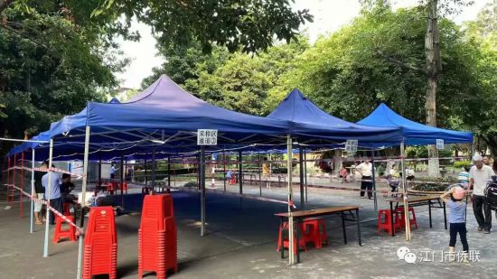 6月7日-9日,江门侨青会理事、江门市本无广告策划有限公司经理黄立峰联合有关公司组织全体员工分别为蓬江区白沙公园核酸检测点、三角塘公园核酸检测点安装了30多顶帐篷、10多台移动空调,并制作现场秩序维护物料、安装指引标识等。6月8日下午,该公司接到新会区七堡广场核酸检测点的紧急需求后,连夜从佛山调来4台移动移动空调并于当晚11点安装完毕,及时为那里的医务人员降温解暑。