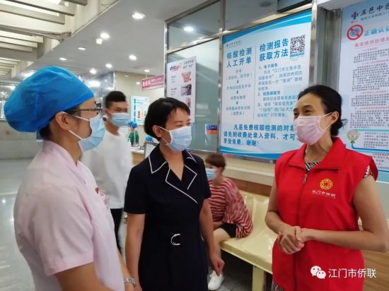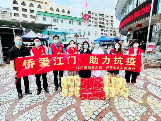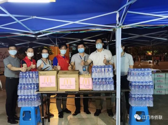 江门市留学生联谊会常务副会长谭小元、副会长梁玉海、监事戴常青发动江门麦当劳餐饮公司员工为蓬江区和新会区的核酸检测站共捐赠1200多份爱心餐饮,参与制作、运输的人员总计56人次。