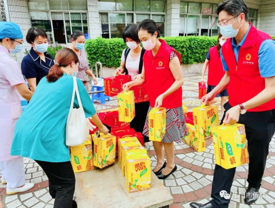 6月10日下午,市侨联党组书记、党支部书记、主席林春晖率江门侨青会到江门五邑中医院开展“抗疫慰问”活动,为医院的抗疫工作人员献上清凉物资和诚挚的问候。“面对疫情,江门市侨联要站在一线,带头帮助群众排忧解难,为‘战疫’贡献侨联力量。”林春晖主席表示,市侨联积极响应政府号召,第一时间发动属下社团,江门侨青会负责人杨学东先生、周炳信先生等捐赠一批爱心物资,希望这些清凉大礼包能够缓解高温给医护人员带来的不适,为他们送去点滴清凉。