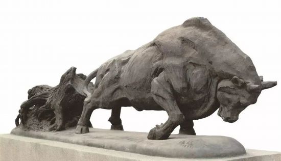 开荒牛后方的树根代表着盘根错节的旧思想旧观念,全身的肌肉紧绷着,身体极力往前倾,似乎是要把身后那代表封建残余势力的树头连根拔起,有一只前脚是跪着的,传递的是这一代人鞠躬尽瘁、任劳任怨的精神。