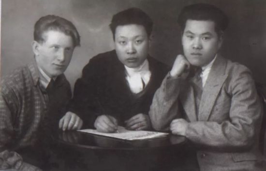 二十世纪三十年代,杨勉(中)在苏联与苏联东方大学同学在一起