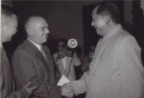 1956年,捷克斯洛伐克共产党代表团访问中国,毛泽东接见团长柯别茨基,杨勉(左)任翻译
