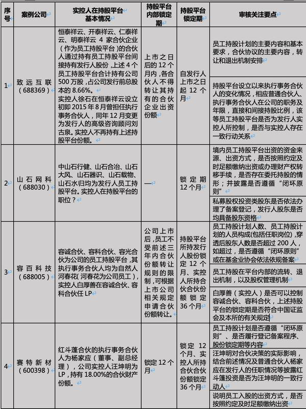 2.反馈问题主要关注了如下方面:(1)持股平台的决策机制;(2)上市主体实控人与员工持股平台的控制关系;(3)持股平台GP与实控人不存在一致行动关系或其他任何特殊协议或安排;(4)出资来源;(5)员工持股计划的股份锁定期安排,是否遵循闭环原则等。