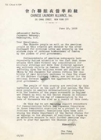 (1938年6月15日衣联会写给美国华盛顿特区日本大使馆的抗议书,抗议日本轰炸中国,屠杀我中国同胞(英文版) 中国华侨历史博物馆藏)