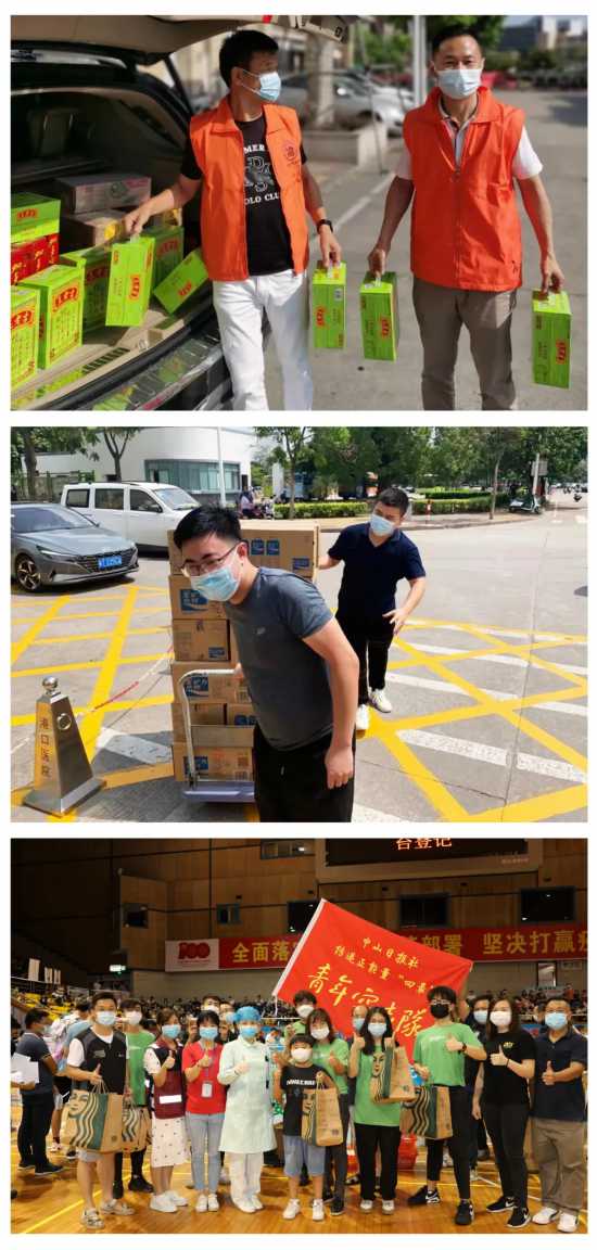侨青联常务副会长余国峰联合大涌镇个私协会为大涌镇新冠疫苗大型临时接种点送上了30箱矿泉水以及200个口罩;常务副会长郑敬尉联合港口个私协会购买夏日清凉饮料80箱,分别送往港口社区人流量最大的两个核酸检测点;海创会副会长梁毅豪与中山华附校友会合资筹备了2000瓶功能饮料慰问医护人员及工作人员;理事杨子骏亲自调制180杯饮料送往中山体育馆,为现场的工作人员送上及时的清凉与关爱。