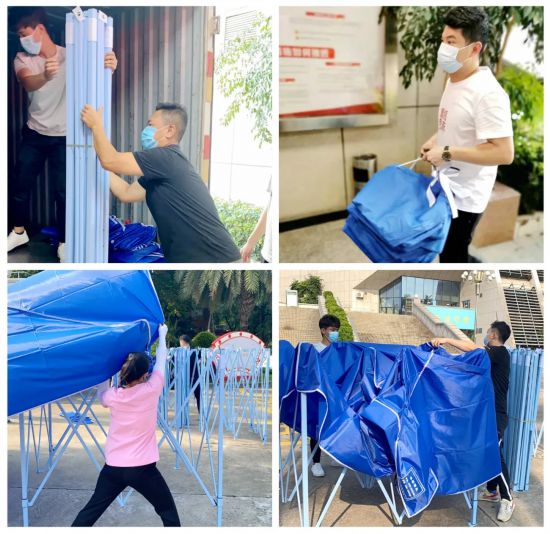海创会副会长林楚东从公司借调了40顶帐篷送至石岐区核酸检测点。2天后在收到秘书处转来的求助信息后,再次调配50顶帐篷于第二天早上运输至中山市体育馆,并协助工作人员、志愿者完成帐篷安装及布置工作,为等候接种新冠疫苗的人民群众遮阳挡雨。