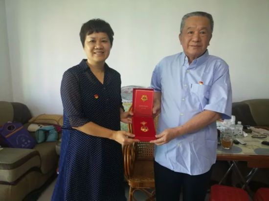 省侨联副主席苏燕(左)为原省侨联办公室干部董庆章颁发“光荣在党50年”纪念章