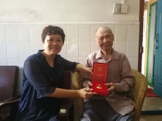 省侨联副主席苏燕(左)为省侨联原党组书记周经纬颁发“光荣在党50年”纪念章