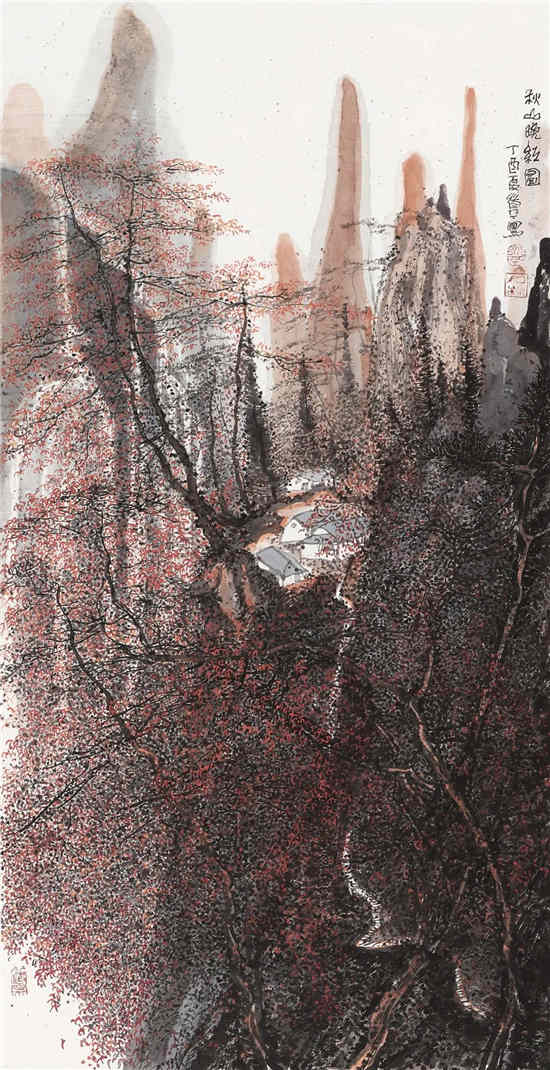 朱道平 秋山晚红图 国画 138cm×70cm