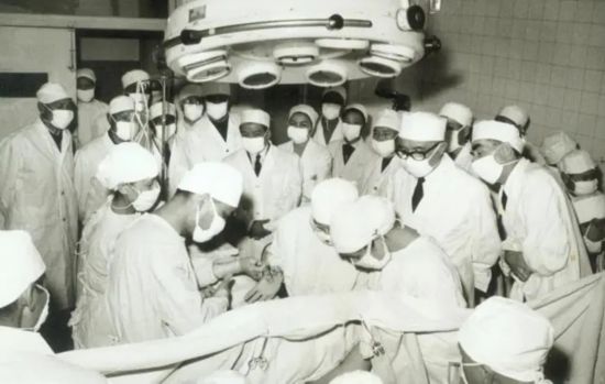 尼克松访华团参观针麻肺切除手术,叶剑英元帅、黑格将军现场观看辛育龄手术。