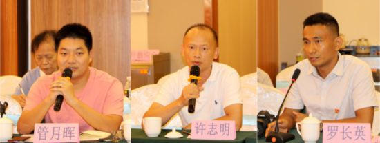 省海归协会会长管月晖(左),美国海南商贸总会执行主席许志明(中),海口市南侨机工眷属联谊会会长罗长英(右)在座谈会上踊跃发言