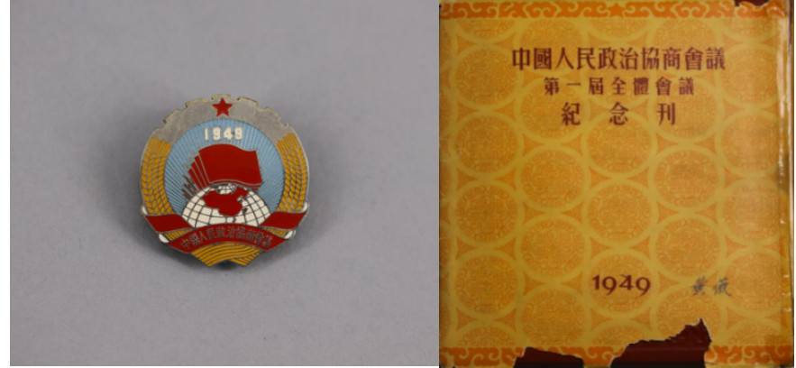 1949年9月,马来亚归侨黄薇参加中国人民政治协商会议时佩戴的会徽和使用过的《中国人民政治协商会议第一届全体会议纪念刊》。